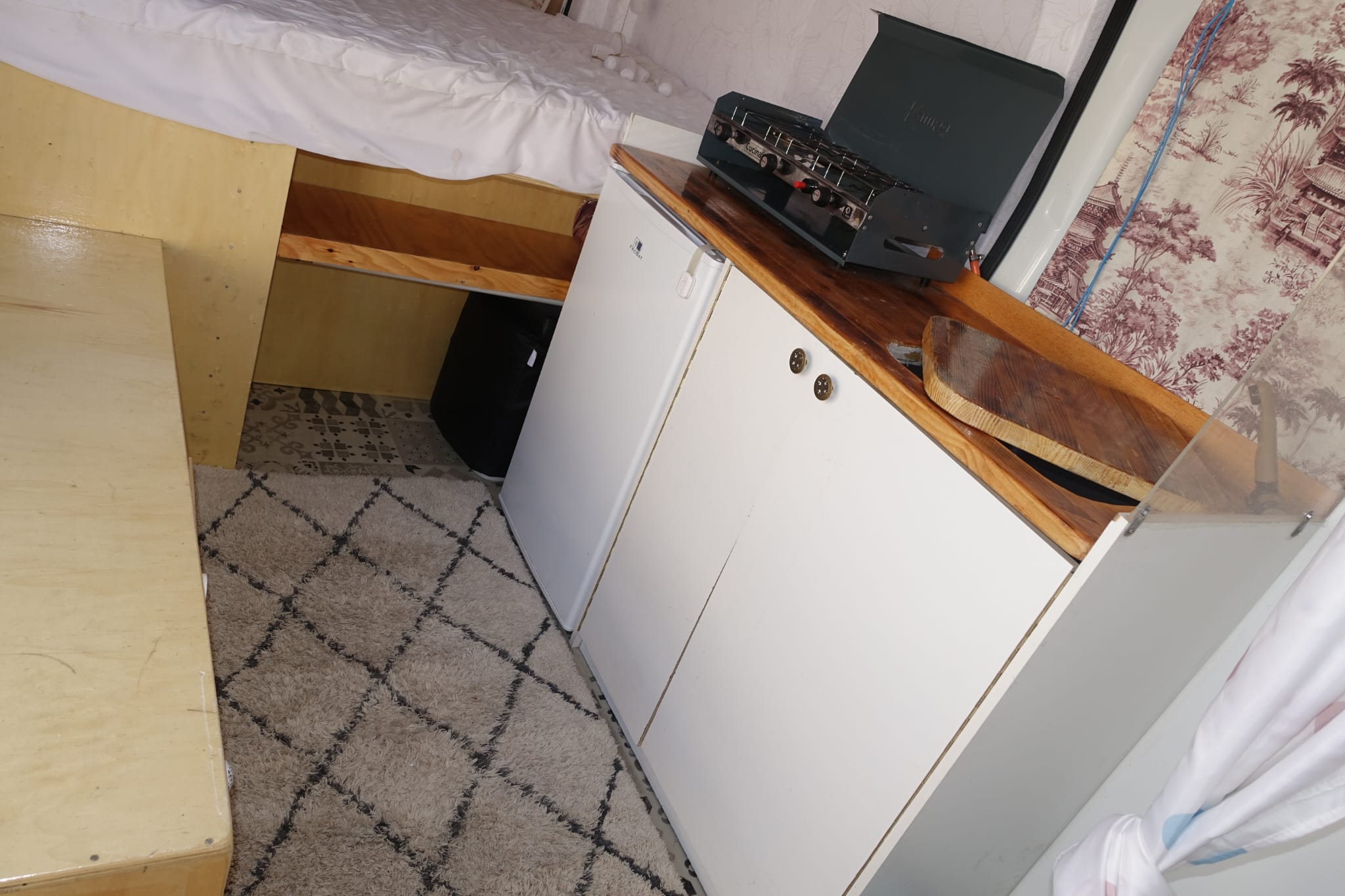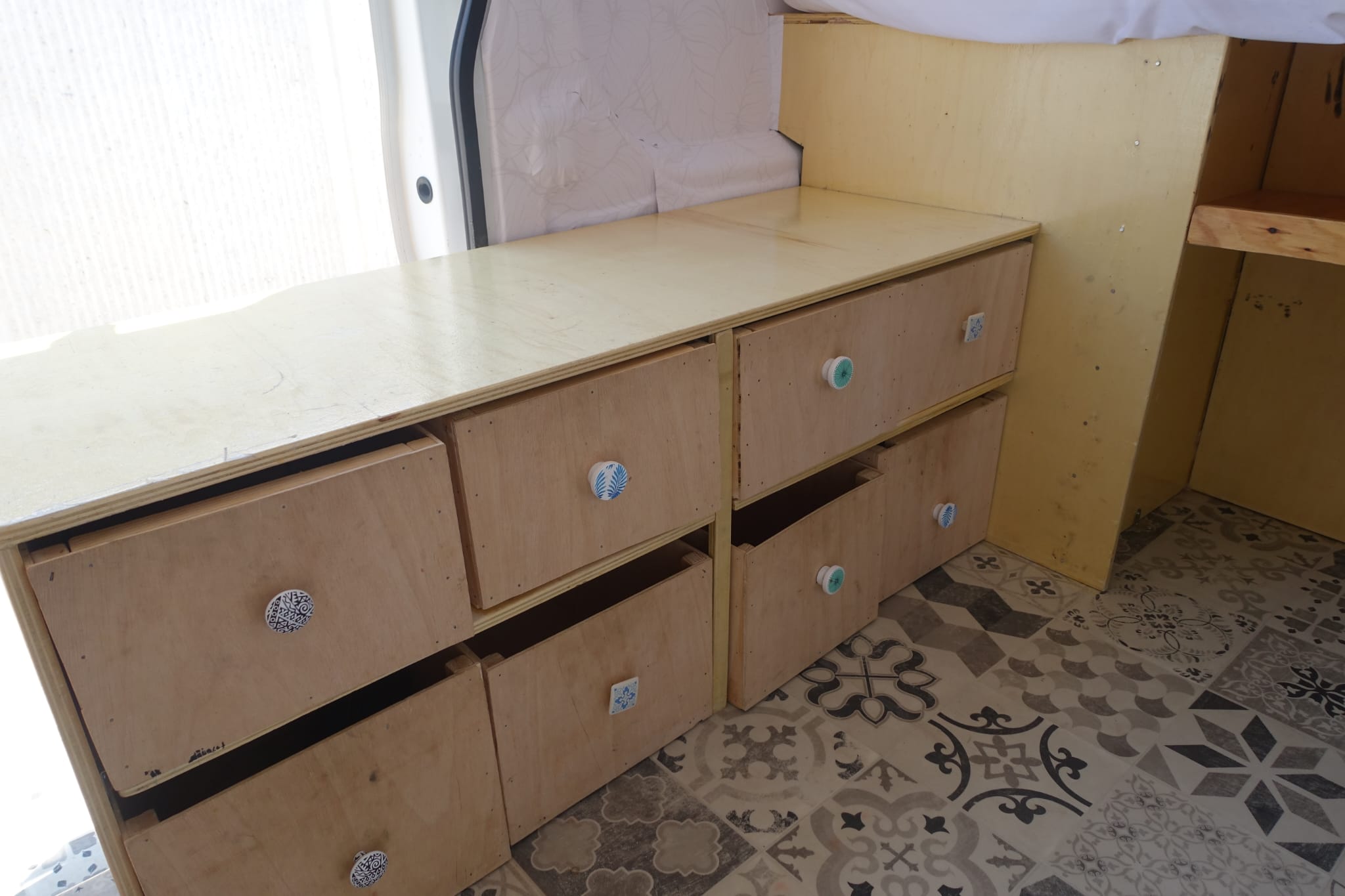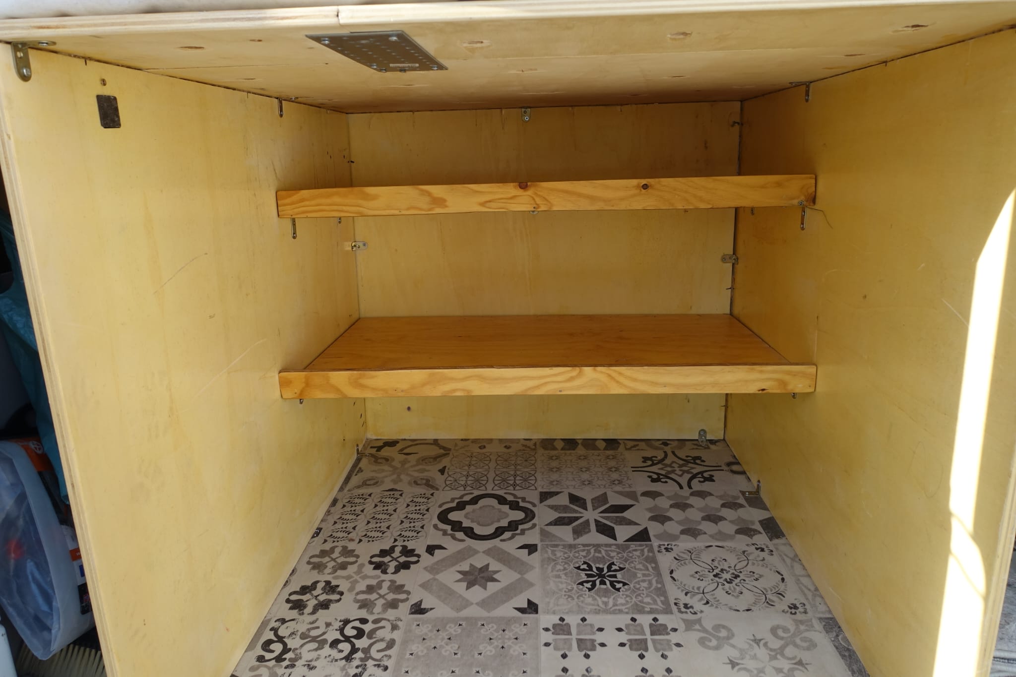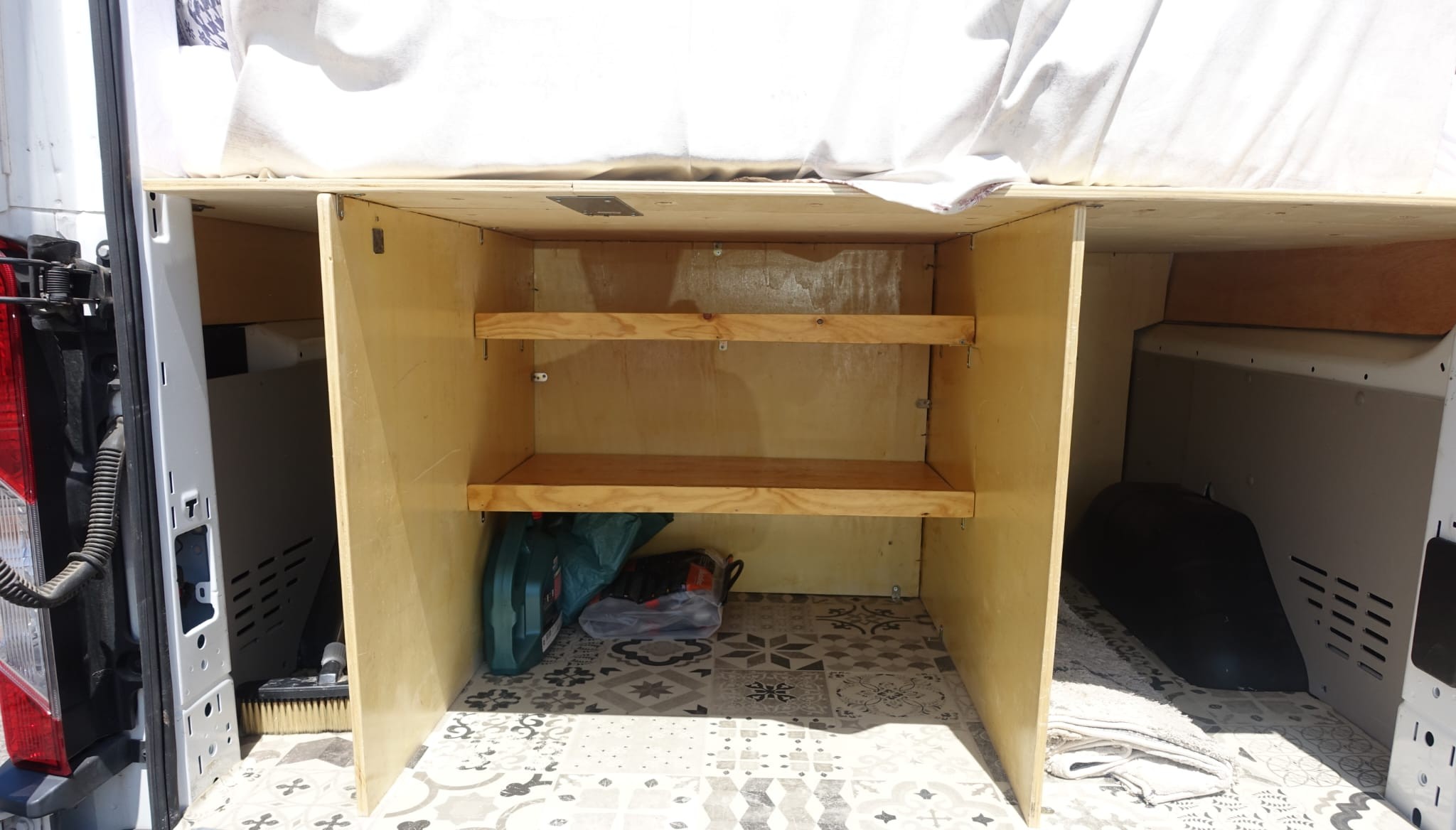 Varias zonas de almacenaje, encima de la cabina, balda debajo de la cama, etc.