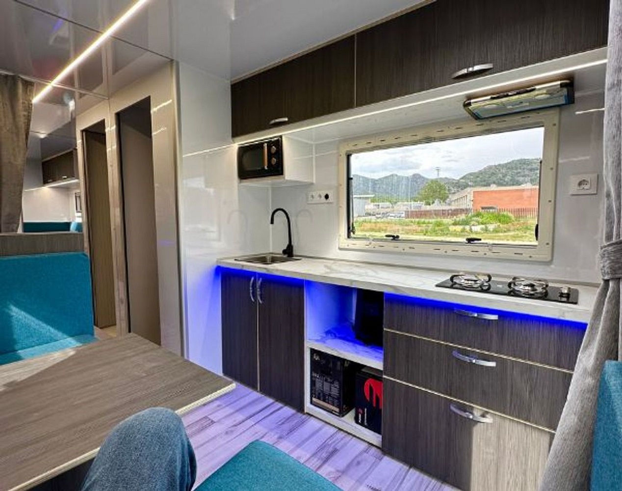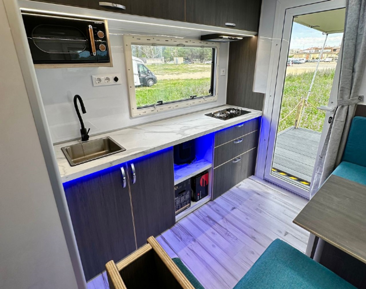 -Cocina de 2.10m equipada con cocina de gas, microondas y cafetera