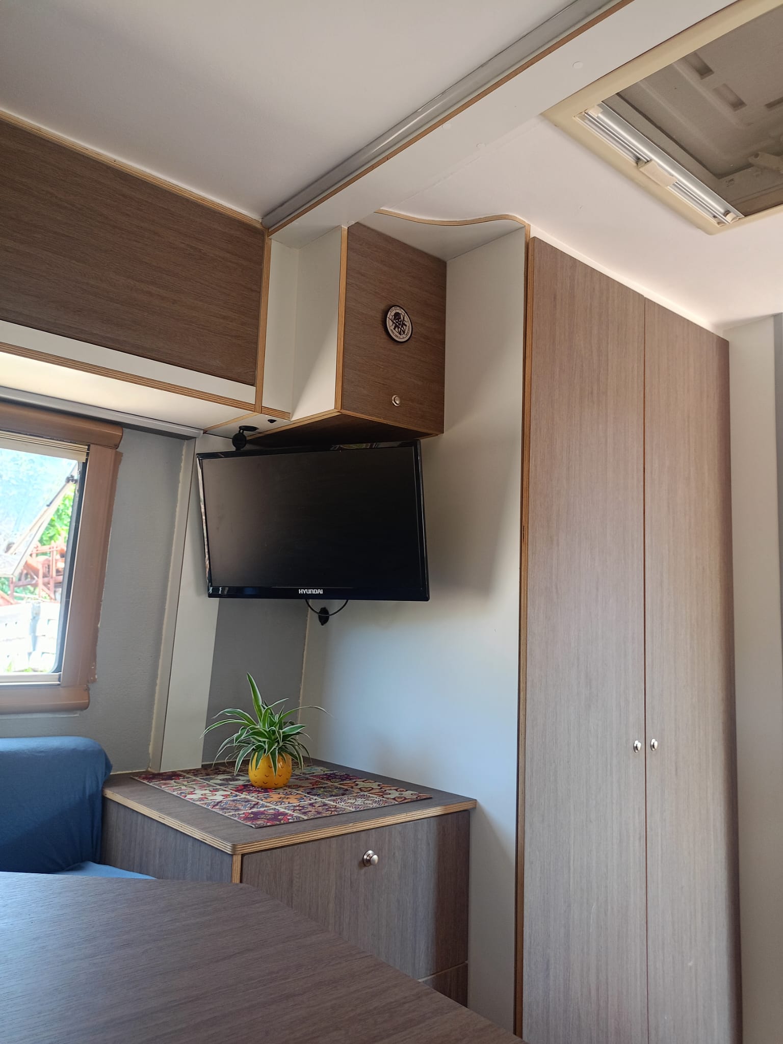 Entretenimiento: antena de televisión omnidireccional OMNI 360 y TV de 22 pulgadas.