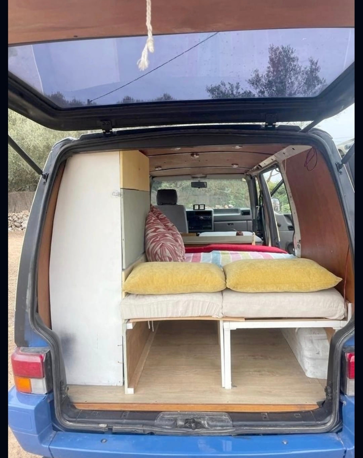 Furgoneta Camper Volkswagen Transporter T4, de 1995, muy cuidada, los últimos años ha estado en Menorca, haciendo pocos kilómetros. Funciona perfecta, motor 2.5, diesel, camperización sencilla artesanal, cama, fregadero, armario, cajones. No hace falta homologar porque son muebles de facil montaje (se podrían desmontar, pero nunca me lo han pedido en ninguna ITV), pasa ITV cada 6 meses. Cambiadas este año las 4 ruedas y la dirección, correa de distribución hace 3 años (pocos km desde entonces). Todo lo lleva al día, y le hago revisiones cada 6 meses, antes de ir a la ITV.