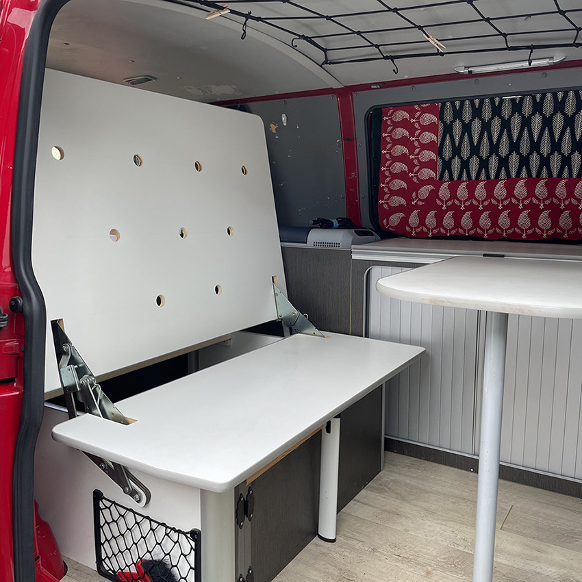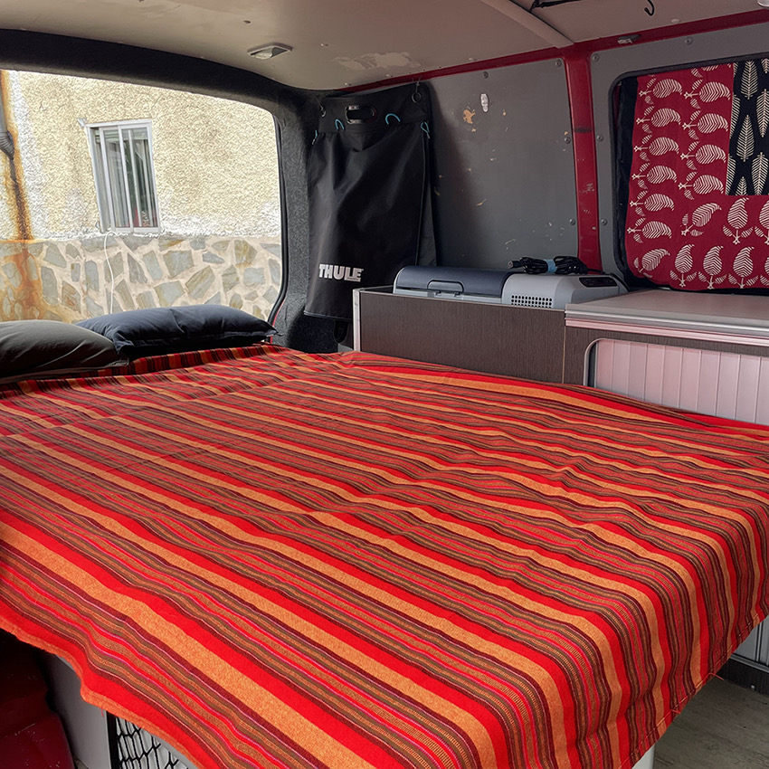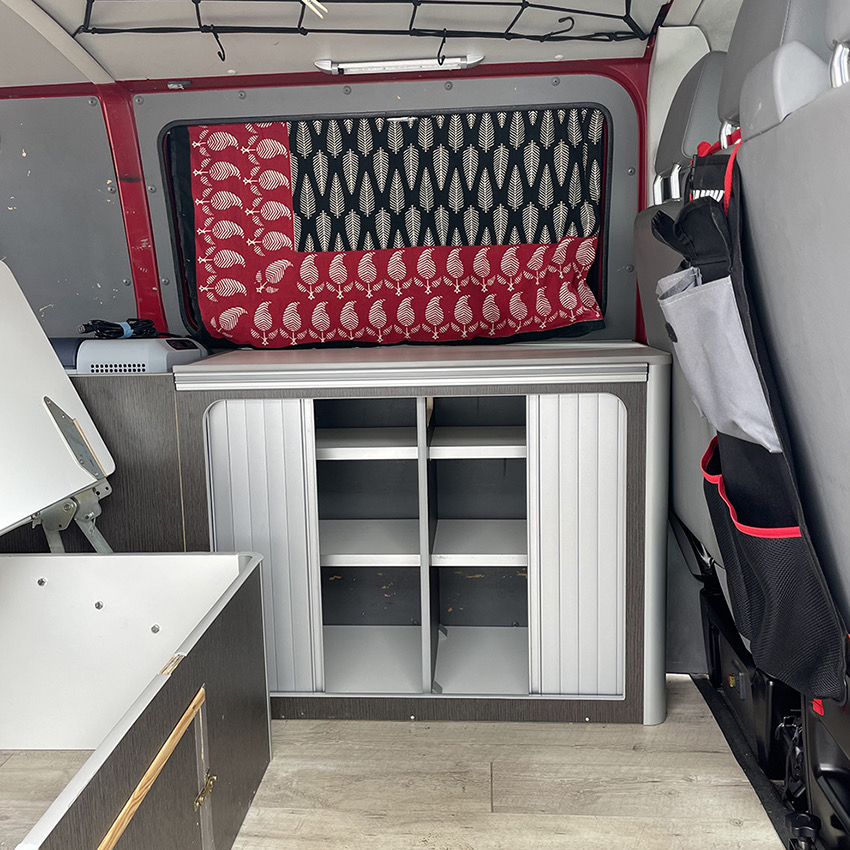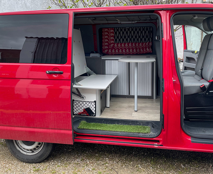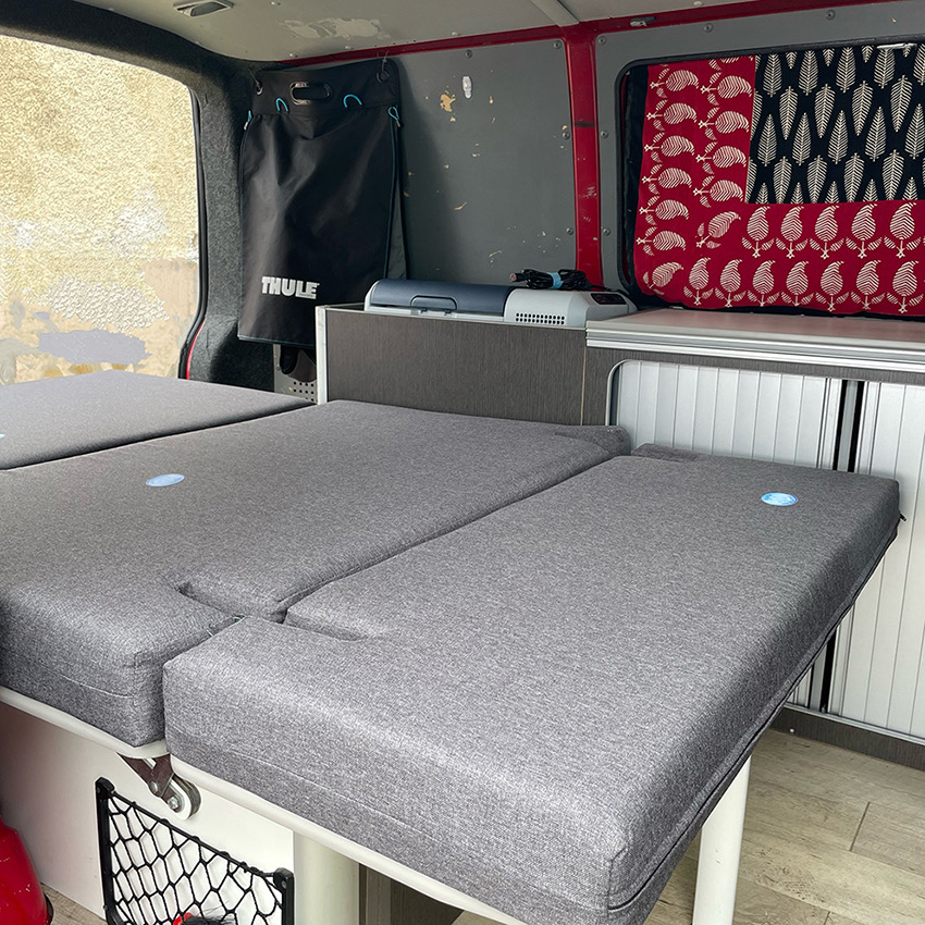 La camperización, realizada en el 2018 por Baovan Campers, es básica pero funcional, todo homologado (clasificación 2448); consta de asiento doble giratorio para hacer salón, dos ventanas traseras y dos laterales, una de ellas corredera. Mueble lateral con nevera Mobicool FR35 alimentada por la segunda batería de litio, que lleva electricidad también a dos leds laterales y a una entrada de 12 V en la parte trasera, ideal para enchufar la ducha exterior. Aislamiento de kaiflex y lana de roca en techo, paredes y suelo. Etiqueta ambiental “B”.
